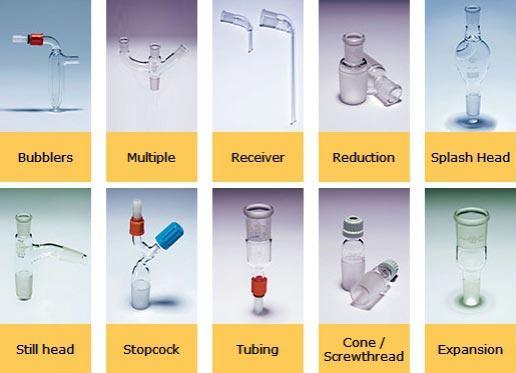 بوتقة كيمياء، ملعقة الصيدلي، أمبولة، أسطوانة مدرجة، برطمان، دورق مخروطي، دورق حجمي، سحاحة، ماصة مدرجة، ماصة حجمية، قمع زجاجي، أنبوب اختبار، ساق زجاجية، قمع فصل، قارورة قطارة، دورق فلورنس، دورق كروي، زجاجة ساعة، هاون ومدقة، مصفاة بوخنر، دورق كالداهل، ماصة بسترة، كروماتوغرافيا العمود، وعاء التجفيف، أنبوب شعري، أنابيب NMR، محقنة، وعاء انحلال، خرز زجاجي، قطارة، ماسك أنابيب الاختبار، سدادسة، قارورة زجاجية للمختبر، شريحة مجهرية زجاجية، غطاء شريحة، زجاجيات قياس الحجم، حلقة على شكل O، مقياس حراري، غطاء زجاجي، موزع المختبر، أنبوب اختبار لاستخدام لمرة واحدة، أنبوب اختبار مع حافة الخرز أو الحافة المستقيمة، دورق زراعة الخلايا، صحن بتري/ طبق بتري، صحن تبخير، أنبوب الطرد المركزي، جهاز ترشيح مختبري، RAY-SORB®، دورق مستدير القاع، دورق مسطح القاع، دورق المختبر، مبخر دوار، التجفيف بالتبريد، قمع النقل / الوزن، زجاج مخروطي، هيدرومتر/ مكثاف، المفاعل الزجاجي المزدوج أ الأحادي الجدار، فاصل السائل الزجاجي، مستقطر زجاجي، مفاعل UV زجاجي، كوع زجاجي، مضخة رش زجاجية، أنبوب زجاجي كيميائي/ صيدلي، مثلث زجاجي، صمام زجاجي، واصلة زجاجية، زجاج قياس، قمع ترشيح، أسطوانة قياس, قمع تنقيط
